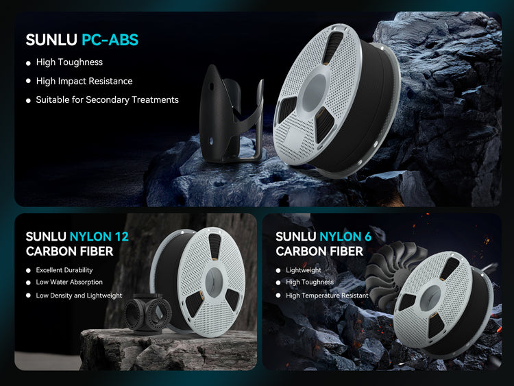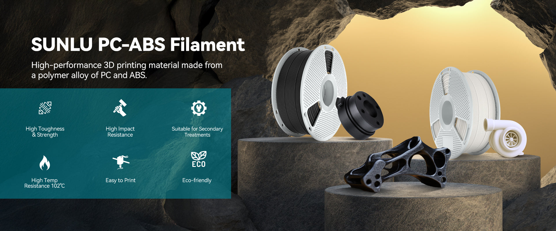 SUNLU PC-ABS Filament is a high-performance 3D printing material made from a polymer alloy of PC (polycarbonate) and ABS (acrylonitrile butadiene styrene). Combining excellent heat resistance and toughness of PC with the enhanced processing capabilities of ABS, printed parts remain stable even under high temperatures and impact. This material also offers a smooth surface finish and is highly compatible with metal coatings, making it ideal for applications that require both strength and aesthetic appeal. Widely used in automotive, electronics, and industrial sectors, PC-ABS delivers high-quality finished products and prototypes.
