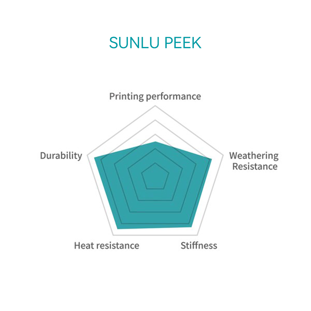 SUNLU PEEK (Polyether Ether Ketone) filament stands at the top of the plastics pyramid, offering outstanding strength, thermal stability, and chemical resistance. Capable of continuous operation at 240°C and short-term exposure above 300°C, it’s ideal for industrial applications where other materials fail.