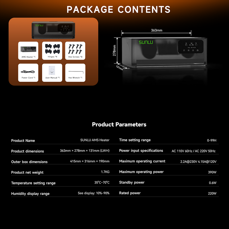 - Do not place the SUNLU AMS Heater within the reach of children. Electrical safety should be observed during operation. Do not use this product near water, such as bathrooms, bathtubs washbasins and other places where water is easily accessible.
