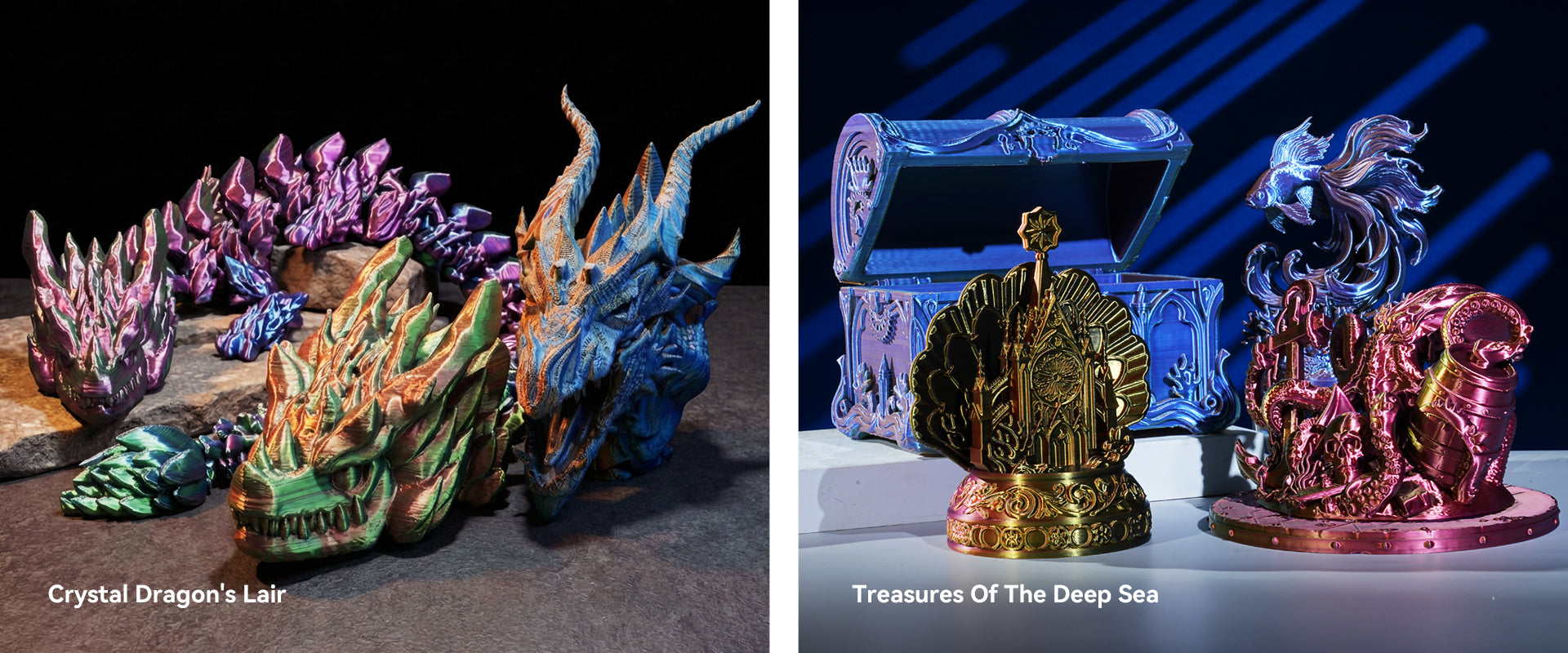 SUNLU Multi Color Silk PLA Plus 3D Printer Filament offers a multi-color printing experience with 1 single filament. Printed creations with varying colors from different angles.