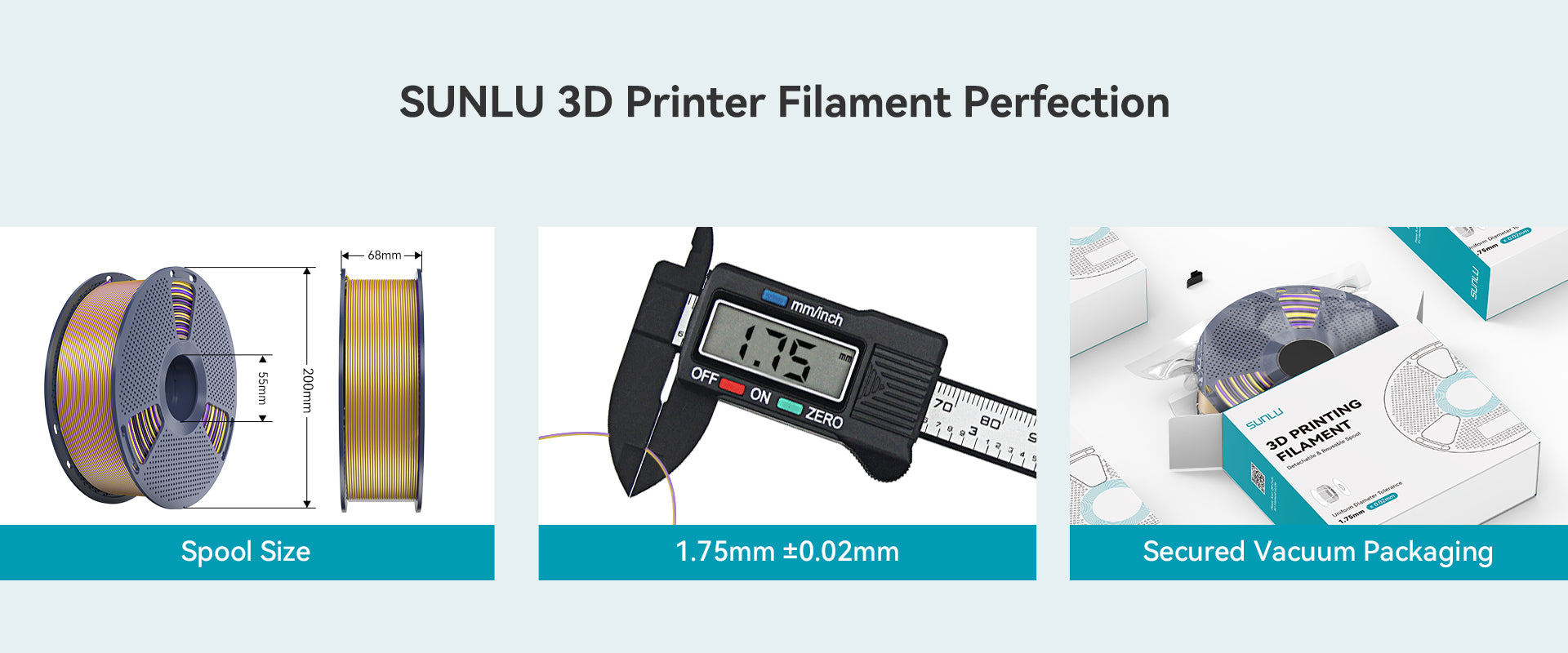 SUNLU 3D printer filament dimensional Accuracy +/- 0.02mm. SUNLU filament has wide compatibility due to the small diameter error. Low shrinkage and uniform diameter (±0.02 mm) ensure smooth feeding and reliable printing results. Works perfectly with most FDM 3D printers (Bambu Lab, Creality, Prusa, Anycubic, etc.).