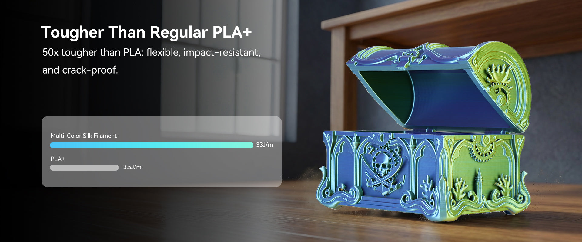 Enhanced Toughness Silk PLA+: With 50 times the toughness of regular PLA, Silk PLA+ stands out for its flexibility without breaking, impact resistance without cracking, and excellent compression strength.