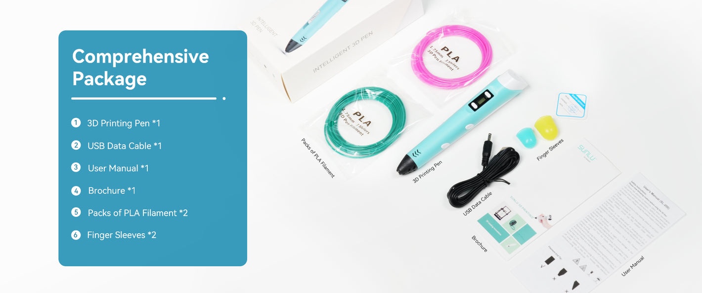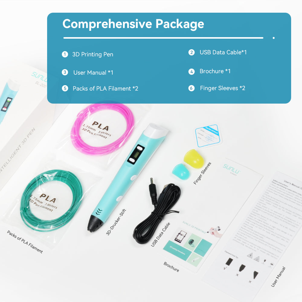 SL-200 package includes everything you need to start creating immediately: the pen itself, a USB data cable, a user manual, a brochure, two packs of PLA filament, and two finger sleeves. The product is ROHS, FCC, and CE certified, ensuring top-notch quality and safety.
