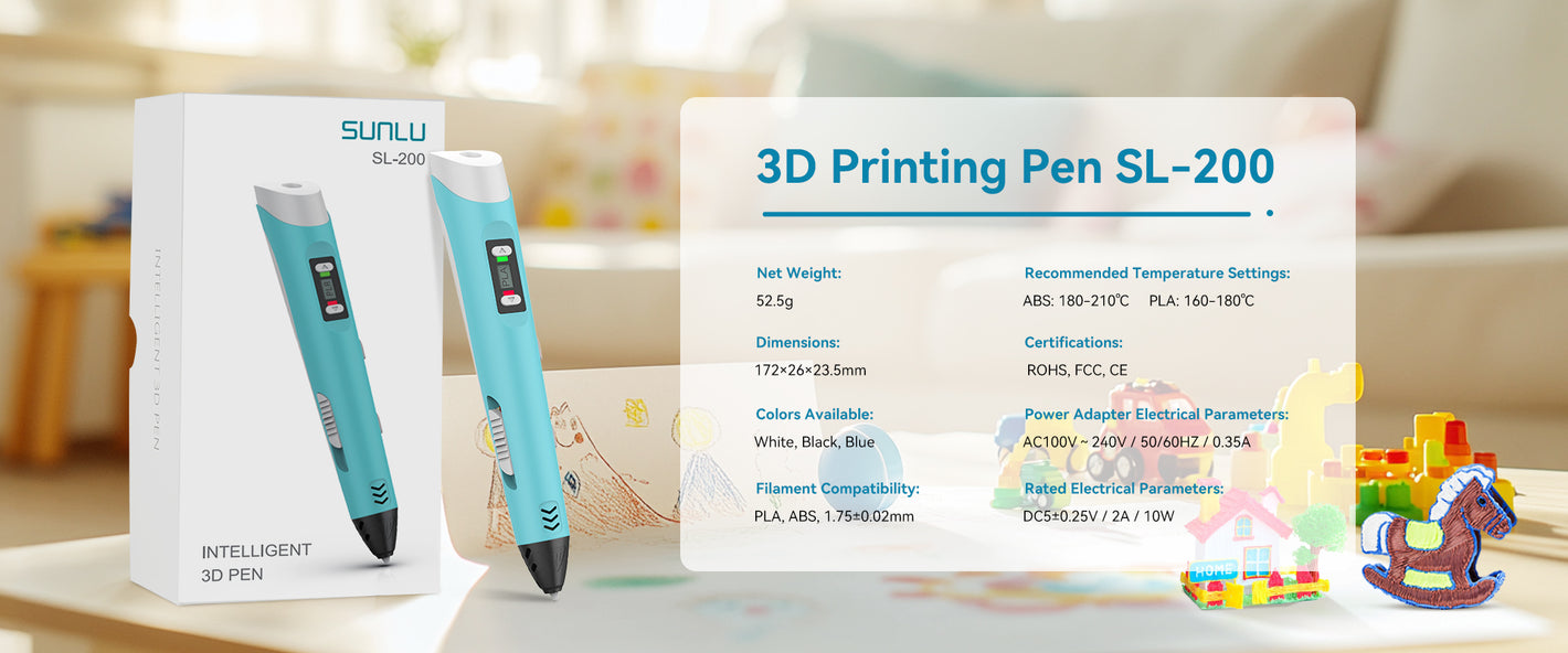 The SL-200 3D Printing Pen comes in an elegant gift box, making it an ideal present for artists, hobbyists, and kids. It includes a one-year warranty, with coverage for manufacturing defects but excludes damage from non-original filament or misuse.