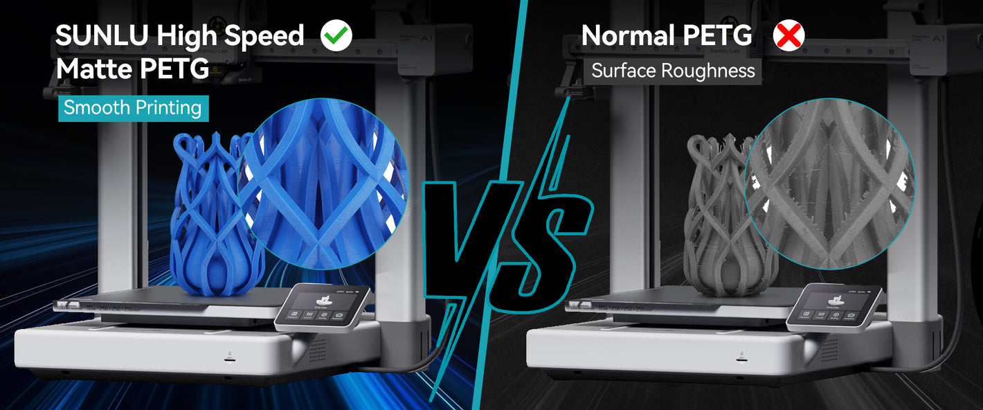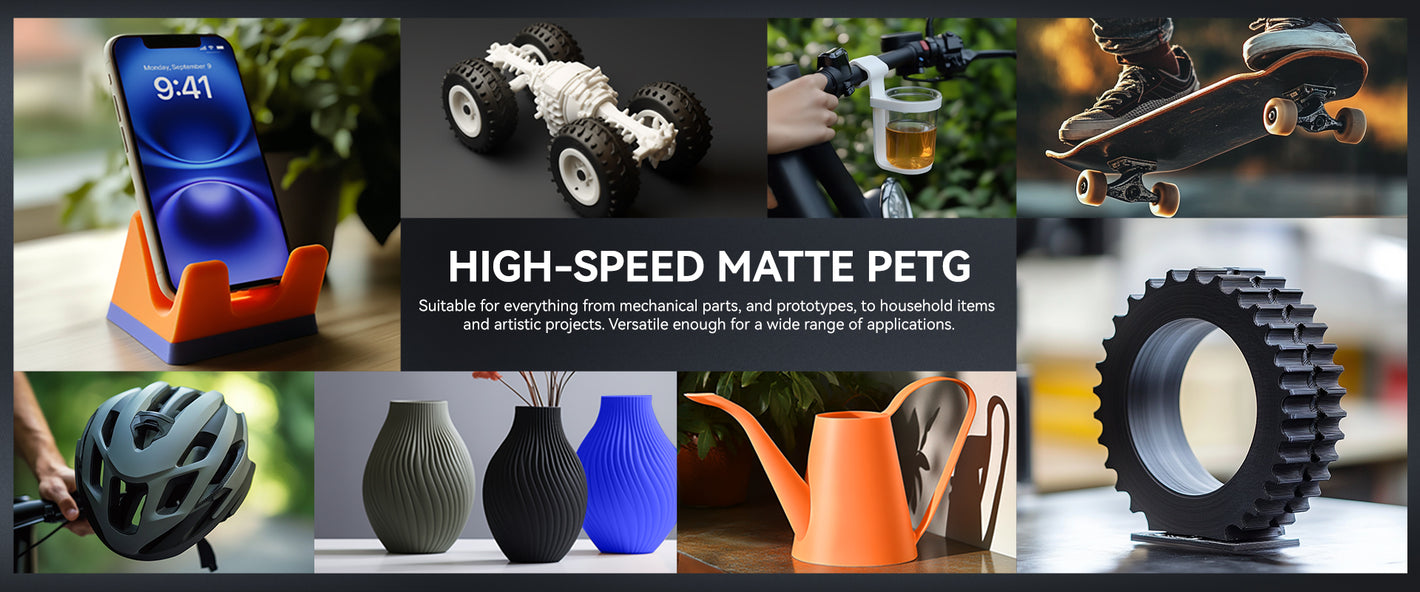 Compared with standard PETG, High-Speed Matte PETG offers both high-speed printing compatibility and a matte surface finish.lts melt flowability is significantly improved, allowing for higher printing speeds.However, please note: due to the increased flowability, moisture absorption will more easily lead to stringing, oozing, and other issues during printing, which may affect print quality.