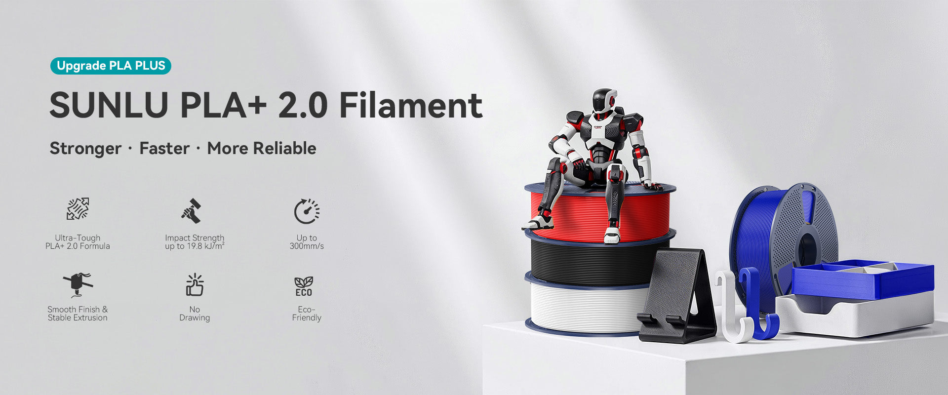 SUNLU 1.75mm PLA PLUS 2.0 3D printer filament(± 0.02mm Tolerance)smooth squeeze. PLA PLUS 2.0 filament is 1.5 times more fluid than regular PLA. Minimum tolerance and low warping to ensure consistent feeding and fast prints, say goodbye to clogging.