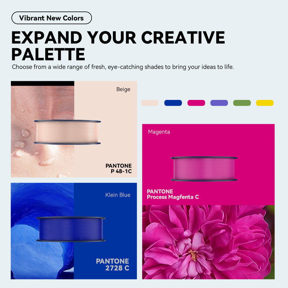 PLA Meta is an upgraded version of PLA, with lower printing temperature, better toughness and softer colors.