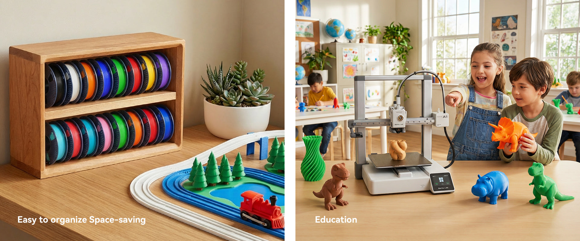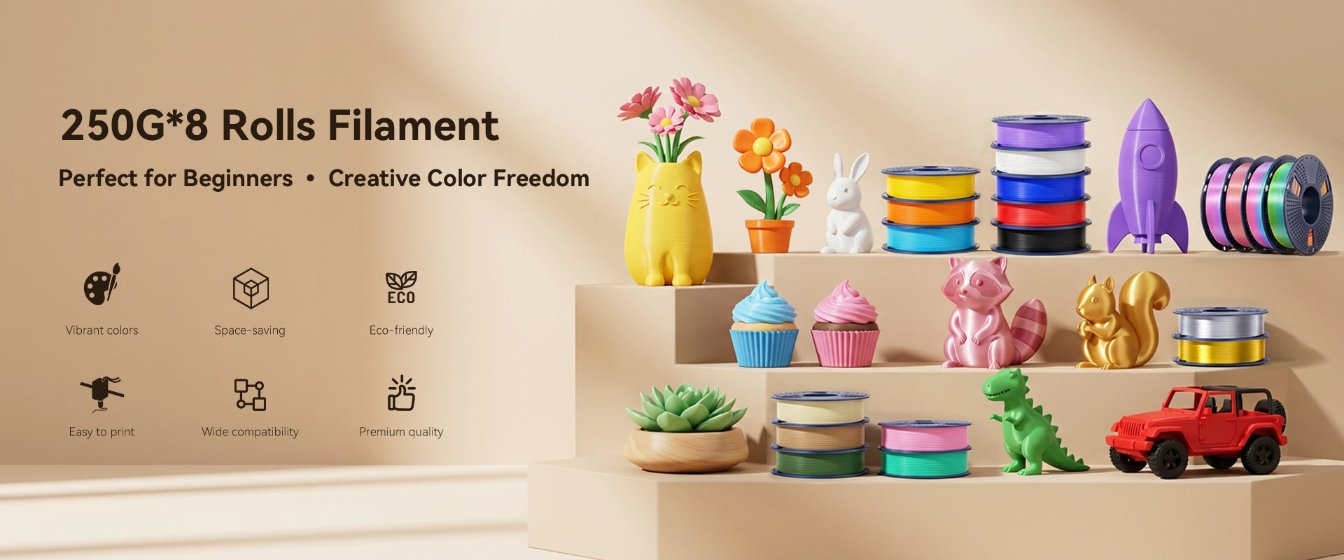 This set includes 8 mini 250g filament spools in vibrant colors, ideal for creative small-scale projects. The compact spools (1/4 size of standard) save space and suit home or classroom use. Easy color switching reduces waste, while plant-based eco-friendly material ensures low odor, safety, and minimal warping (0.1%-0.3% shrinkage). Achieve precise prints with peace of mind.
