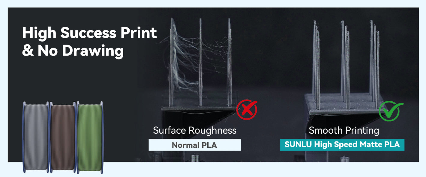 【Fantastic & Smooth Matte Finish】The SUNLU PLA matte filament finish is great and helps to hide layer lines, bringing out other details of the print Prints smooth and have a beautiful matte finish.SUNLU's nice PLA matte filament is achieved without compromising bed and layer adhesion, which results in beautiful and fairly strong PLA filament parts. Almost metallic finish and a soft smooth finish.