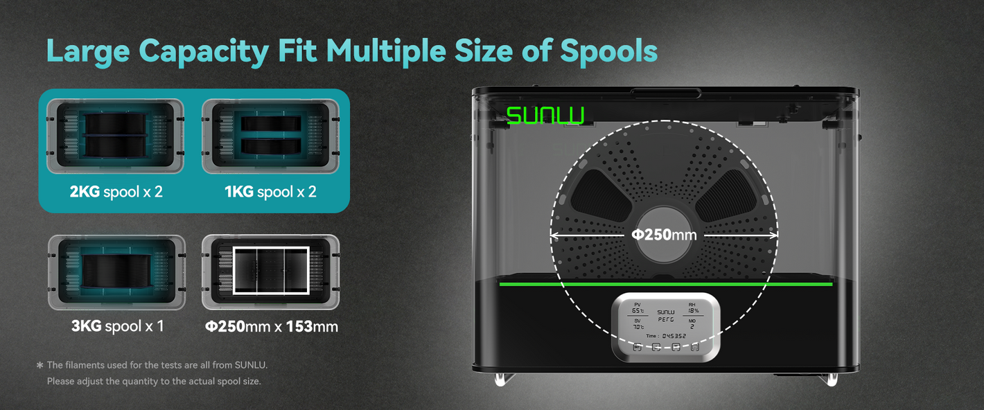 [Extra Large Interior Space, Super Adaptability] The maximum compatible spool size is Φ250mm*153mm, which is suitable for most of the regular spools on the market. Tested, it can hold 2 reels of regular 1KG spools, 1 reel of regular 2KG spools or 2 reels of regular 3KG spools. (Note that the test spools are SUNLU spools, other brands of spools will have slight differences, but basically compatible, when using the need to pay attention to the size of the spool.)