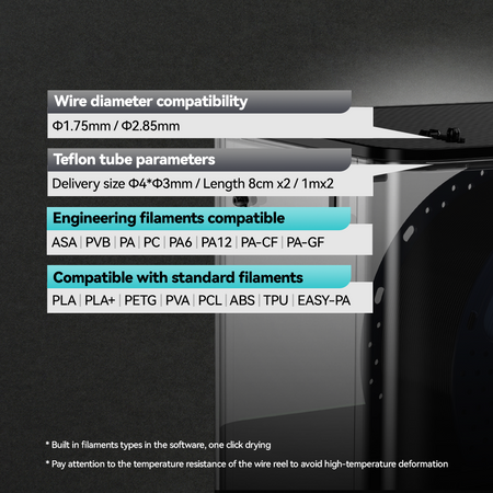 [Strong Compatibility, Adapts to 99% of the use scenarios] Can be applied to both engineering materials and conventional materials. Built-in preset filament settings, one click to apply the preset. The wire diameter is compatible with most of the materials on the market (Φ1.75mm, Φ2.85mm), and the Teflon tubing included with the product is Φ4*Φ3mm in size and 8cm*2 and 1m*2 in length.