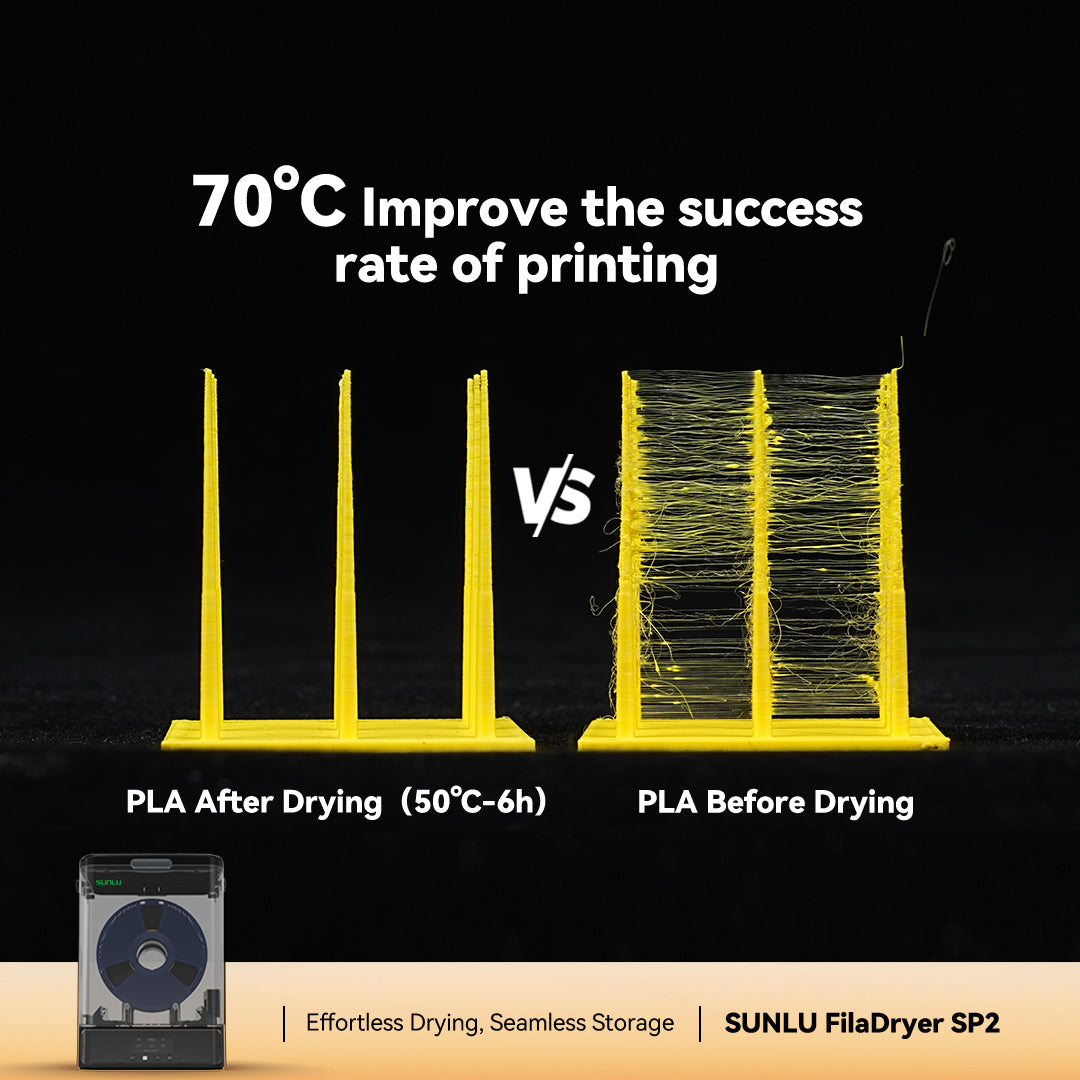 1. The maximum heating temperature of SUNLU Filament Dryer SP2 is up to 70 ℃, please carefully observe the current set parameters (such as filament type, heating temperature) is consistent with the actual need to dry the filament, to avoid too high a temperature leading to deformation of the filament (filament drying temperature, recommended product manuals or this product page of the filament spool data)For example, if the machine is set to operate at ≥70°C, the temperature resistance of the spool of the filament you are using should be ≥70°C to avoid deformation of the spool.