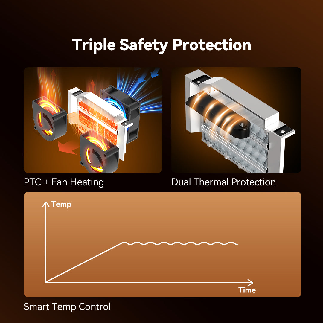 [Strong Safety, Stress-free Use] The triple safety design of 200W PTC + fan heating, secondary temperature protection switch and software intelligent temperature control ensures the heating process is foolproof.