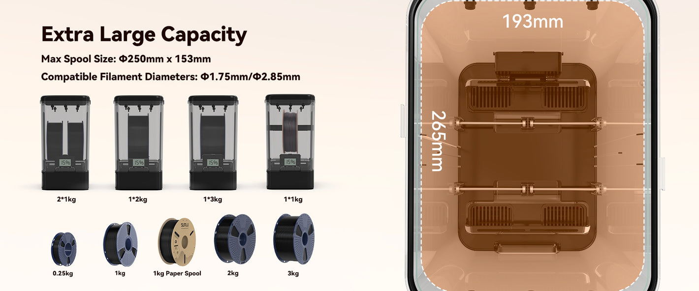 [Large Internal Space and Spool Compatibility] Internal compatibility with 0.25~3kg spools, even paper spool can also be realized by fixing the spool roller. The storage box compartment can hold two rolls of 1kg filaments, one roll of 2kg (2 rolls of 2kg filaments for SUNLU), and 3kg filaments, and supports a maximum spool diameter of 250mm and a maximum spool width of 153mm. it is compatible with both 1.75mm and 2.85mm diameter filament. Even damaged spools can be fixed with the spool roller.