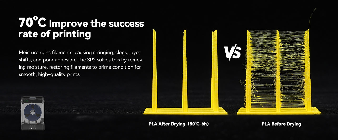 SP2 has super adaptability to most universal filaments on the market. Its working temperature range: 35°C-70°C. It can be compatible with 99% of general filaments and some functional filaments like: PLA, PLA+, PETG, ABS, TPU, PVA, PVB, ASA, PA/PC etc.