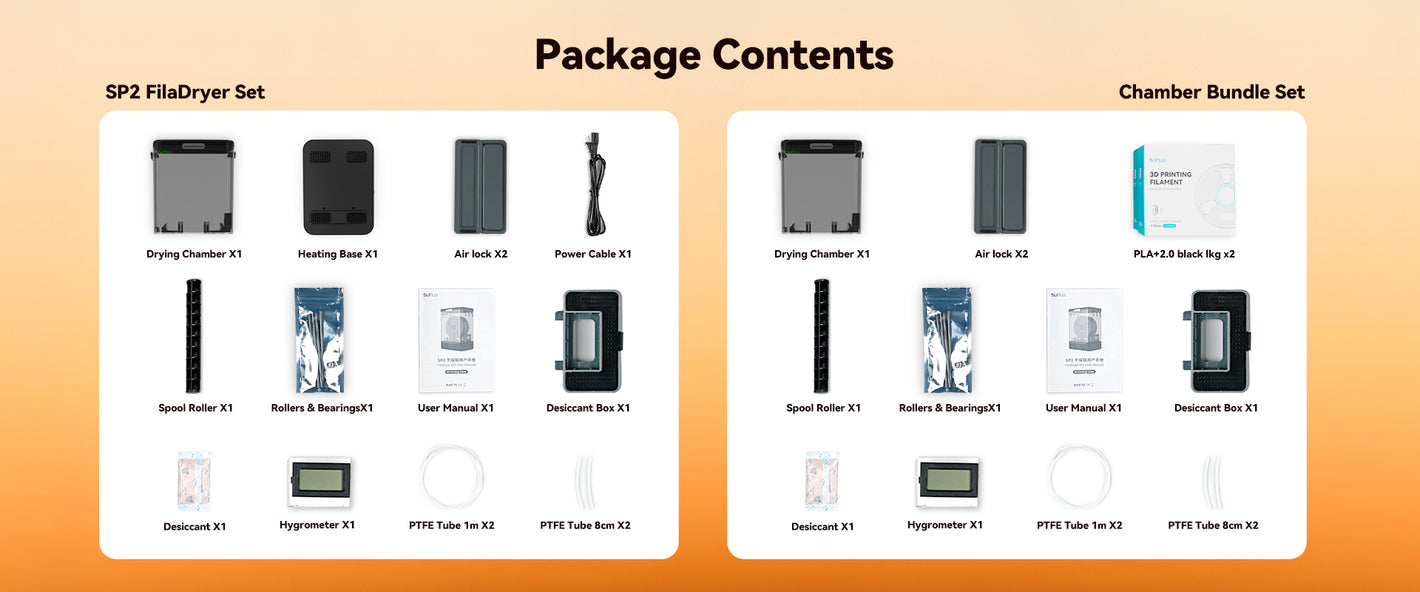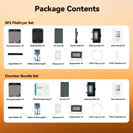 Package Contents:FilaDryer SP2 Set: Storage Box *1, Heating Base *1, Hygrometer *1, Desiccant *1, Desiccant Box *1, Power Cable *1, Spool Roller *1, Air lock *2, PTFE Tube 8cm *2, PTFE Tube 1m *2, User Manual *1