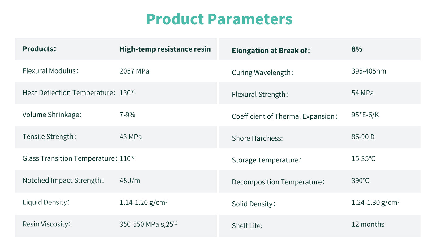 Good temp-resistance: It can withstand up to 180℃/15 mins, 150℃/1 h and 80℃/7days. Printed modelsown high thermal stability avoiding cracking and deformation at high temp..